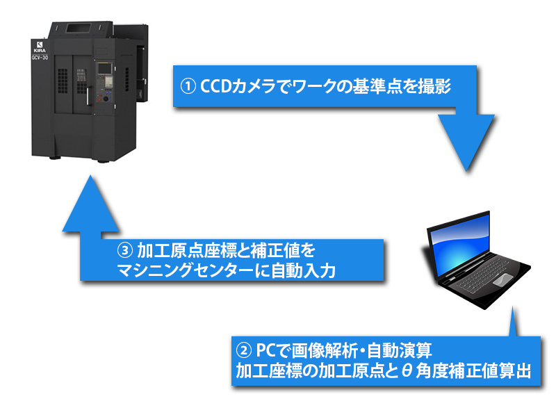 | 改善点 | CCDカメラでワーク基準点を撮影。座標原点を自動設定。 |