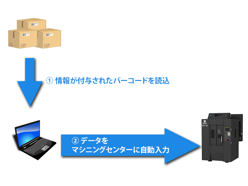 | 改善点 | 加工品のデータを付与されたバーコードから情報を自動でマシニングセンターへ入力 |