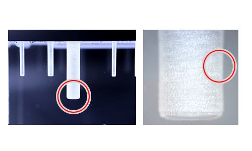 超音波あり/なしで、ダイヤモンド電着ツール先端とザグリ穴表面のチッピングを比較しました。