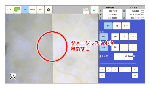 ツール摩耗低減、加工穴径が安定 ダメージレス加工 粗いメッシュのツールでもクラックが浅い |